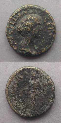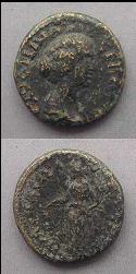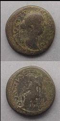 Roma seated left, helmeted, holding Victory and spear, shield below throne